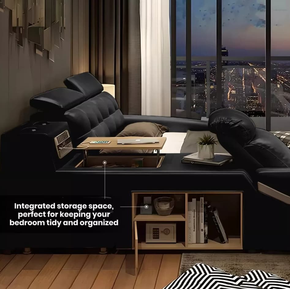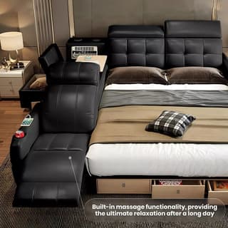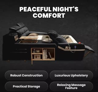 Upon acquiring this king-size bed, I was immediately impressed by its stately presence and impeccable design. The bed's construction, a solid blend of pine and fiberwood, provided a firm foundation that spoke of its durability and attention to quality. This robust framework was complemented by the genuine leather upholstery, which not only added a touch of luxury and refinement but also promised a tactile experience that was both inviting and indulgent. The leather's texture and warmth contributed to a sense of opulence and comfort that was both seen and felt, creating a bedroom centerpiece that was as aesthetically pleasing as it was functional. Exploring the bed’s functionality, I was particularly captivated by its practical storage features. The thoughtfully designed storage compartments seamlessly integrated into the bed’s structure, offering a convenient solution for organizing and stowing away belongings. This design ingenuity not only maximized the utility of the bed but also enhanced the overall aesthetic of my bedroom by minimizing clutter. The ease with which I could access and utilize this storage space made it clear that this bed was designed with the user’s convenience and lifestyle in mind, merging practicality with elegance in a way that elevated the entire bedroom experience. The pinnacle of the bed's luxurious features, however, was its relaxing massage functionality. This innovative addition transformed the bed from a mere sleeping platform into a personal retreat, where relaxation and rejuvenation were just a button press away. The massage feature, with its adjustable settings, offered a personalized relaxation experience that helped alleviate the stresses of daily life, making every night a therapeutic session. The ability to enjoy such luxury in the privacy and comfort of my own home was truly transformative. It redefined my perception of bedroom comfort, integrating rest, relaxation, and luxury into a single, cohesive experience. This bed, with its combination of sturdy construction, luxurious detailing, smart storage, and therapeutic massage, was more than just a piece of furniture; it was a sanctuary that offered a respite from the outside world, embodying the essence of comfort and luxury in every aspect